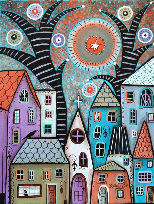 This is a 147 piece wooden jigsaw puzzle of Karla Gerard's painting "Dusk." Puzzle design by Maria Berg has themed abstract pieces and a few whims...