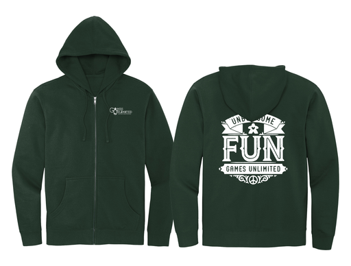 A 65/35 cotton/poly blend hoodie in forest green with the Games Unlimited lapel logo and Unbox Some Fun rear decoration. Show of your GU pride!