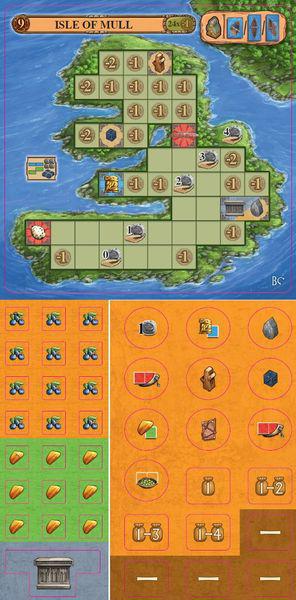 - New B-island: Isle of Mull (1v, 4 income, 9vp, salted meat, ore, wood, goldgubber, egg and stone + once an altar (6 spaces, 1x4+1x2 middled, not buyable, not smithable and not plunderable - simply reserved to Isle of Mull)