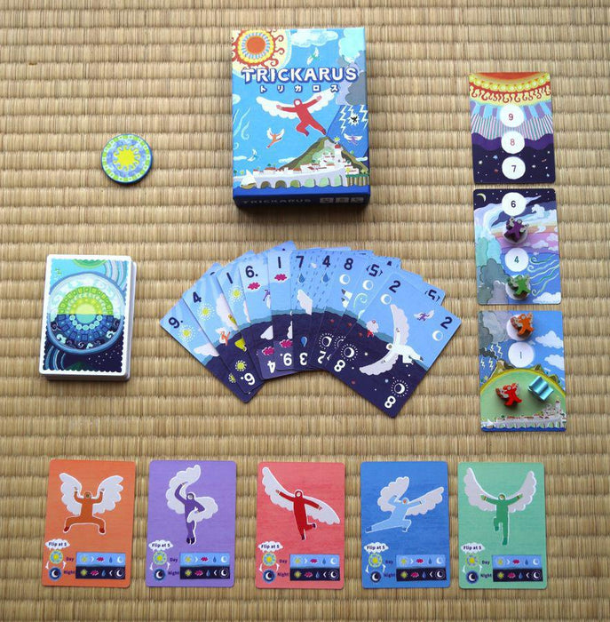 Icarus & his friends have crafted handmade wings. Day and night, jubilant with their newfound freedom, they fly higher & higher... A trick-taking game of flying, flipping, & trying not to soar into the hot, hot sun.